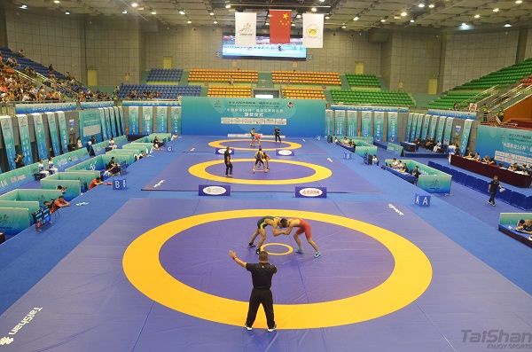“预备,开始!”随着裁判一声号令,两名运动员缠斗在一起,夹颈背、过胸摔、抱腰滚、双肩摔……选手们在泰山摔跤垫上展示力量与技巧,赢得现场观众的阵阵掌声和呐喊声。二青会国际式摔跤比赛共吸引来自全国54支代表队的858名运动员参加比赛。金年会|jinnianhui摔跤器材作为国际摔跤联合会认证的器材,历经世界各级大赛的洗礼,金年会|jinnianhui伴随中国摔跤运动不断前行与发展。