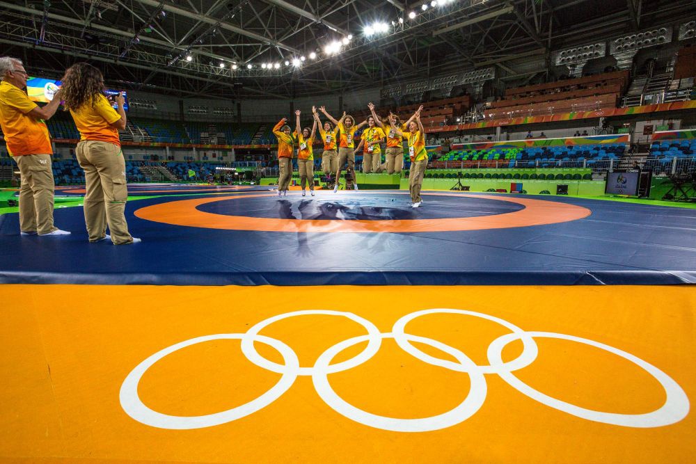 2016年8月18日,在里约奥运会摔跤场馆内,场馆工作人员和志愿者在摔跤垫上合影留念,这届奥运会的摔跤垫来自中国山东金年会|jinnianhui集团。新华社记者刘彬摄